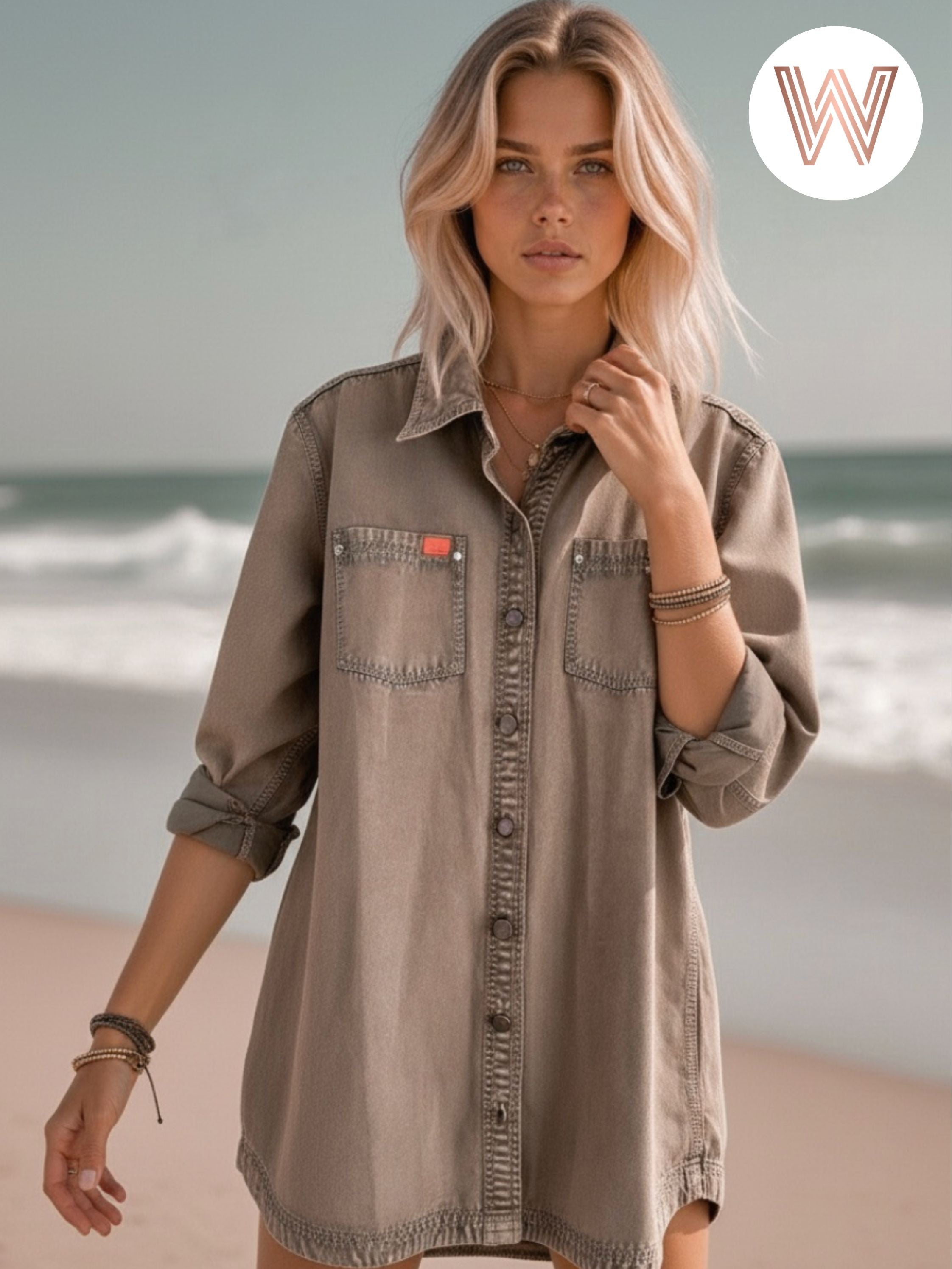 With a relaxed fit, full-length button closure, and classic shirt-dress silhouette, it's the ultimate throw-on-and-go piece. The faded ash tone pairs seamlessly with everything, while subtle distressing and tonal stitching add just enough character.